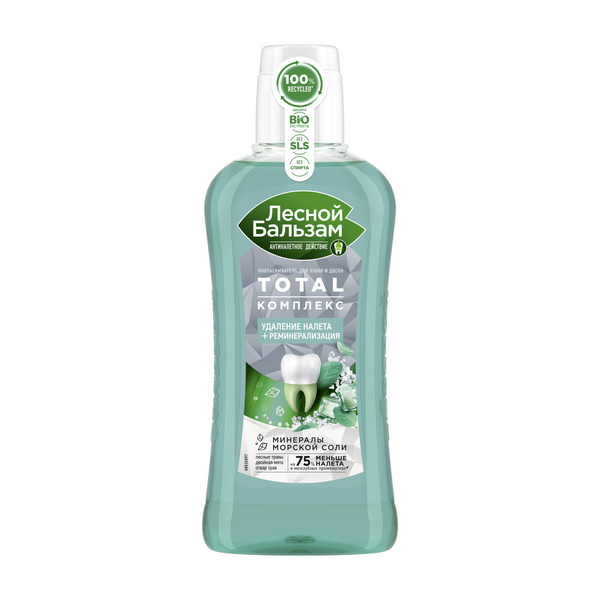 Профилактический ополаскиватель Лесной бальзам Тройной эффект Экстрасвежесть надолго подарит вам ощущение свежести дыхания и обеспечит максимальную защиту от неприятного запаха изо рта в течение дня. Очищает до 100% полости рта, нейтрализует действие патогенных бактерий в полости рта и значимо снижает скорость образования налета. Ополаскиватель обладает выраженным мятным вкусом и сочетает в себе сразу 3 действия, позволяя достичь максимальной защиты всей полости рта*: 1. Укрепляет десны благодаря запатентованной формуле на отваре трав (90% отвара трав), усиленной соком алоэ и экстрактом молодых листьев черной смородины. 2. Защищает от кариеса и укрепляет эмаль за счет минерального комплекса с фтором. 3. Дарит длительное ощущение свежести и защищает от образования неприятного запаха изо рта за счет усиленной формулы с натуральной мятой. Клинически доказано: ежедневное использование серии Тройной эффект (зубная паста + ополаскиватель) в 3 раза снижает образование налета на зубах – основной причины кариеса и проблем десен.* Рекомендации: - Рекомендован в качестве профилактического средства для укрепления десен и против неприятного запах изо рта (при галитозе). - Использовать после каждой чистки зубов, а также после еды для очищения межзубных промежутков.