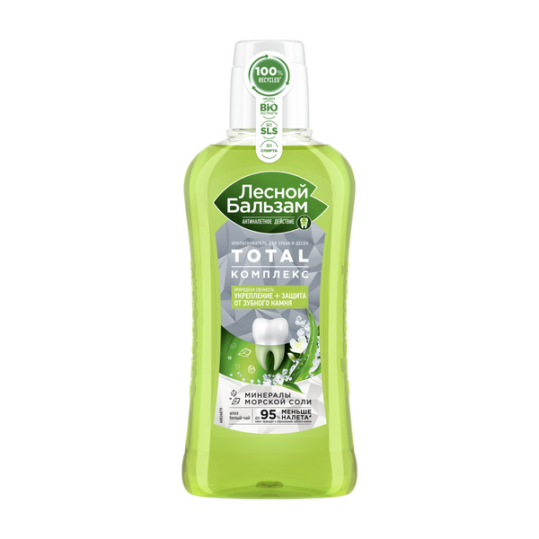 Попробуй новый ополаскиватель Лесной бальзам TOTAL Комплекс с морской солью, соком алоэ и экстрактом белого чая. Формула ополаскивателя на 98% состоит из ингредиентов натурального происхождения, интенсивно очищает зубы от налета, защищает от зубного камня и препятствует развитию кровоточивости десен, обеспечивая комплексную защиту всей полости рта. Формула ополаскивателя TOTAL Комплекс борется с первопричиной развития серьезных проблем полости рта – зубным налетом, который вызывает кариес, влияет на изменение цвета зубов, приводит к образованию зубного камня и кровоточивости десен. Формула ополаскивателя усилена минеральными компонентами и экстрактами трав, не содержит парабенов и спирта, имеет самый мягкий вкус в линейке Лесной бальзам и рекомендована стоматологами для ежедневного использования: • морская соль защищает от бактерий и помогает предотвратить разрушающее действие налета на эмаль зубов; • сок алоэ и экстракт белого чая укрепляют десны, защищают от кровоточивости. Используй ополаскиватель Лесной бальзам TOTAL Комплекс после каждой чистки зубов и избавься от налета в два счета! Он поможет значимо улучшить домашнюю гигиену полости рта, а именно1: • лучше очищать зубы от налета и качественно прочищать межзубные промежутки • сохранять ощущение чистых зубов дольше за счет снижения скорости появления налета на зубах; • защищать от образования зубного камня; •