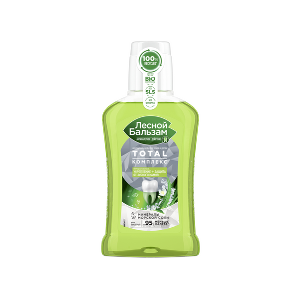 Попробуй новый ополаскиватель Лесной бальзам TOTAL Комплекс с морской солью, соком алоэ и экстрактом белого чая. Формула ополаскивателя на 98% состоит из ингредиентов натурального происхождения, интенсивно очищает зубы от налета, защищает от зубного камня и препятствует развитию кровоточивости десен, обеспечивая комплексную защиту всей полости рта.Формула ополаскивателя TOTAL Комплекс борется с первопричиной развития серьезных проблем полости рта – зубным налетом, который вызывает кариес, влияет на изменение цвета зубов, приводит к образованию зубного камня и кровоточивости десен.Формула ополаскивателя усилена минеральными компонентами и экстрактами трав, не содержит парабенов и спирта, имеет самый мягкий вкус в линейке Лесной бальзам и рекомендована стоматологами для ежедневного использования: • морская соль защищает от бактерий и помогает предотвратить разрушающее действие налета на эмаль зубов; • сок алоэ и экстракт белого чая укрепляют десны, защищают от кровоточивости.Используй ополаскиватель Лесной бальзам TOTAL Комплекс после каждой чистки зубов и избавься от налета в два счета! Он поможет значимо улучшить домашнюю гигиену полости рта, а именно1: • лучше очищать зубы от налета и качественно прочищать межзубные промежутки • сохранять ощущение чистых зубов дольше за счет снижения скорости появления налета на зубах; • защищать от образования зубного камня; • заботиться об укреплении десен и зубов.Клинически доказано: до 95% меньше налета1!
