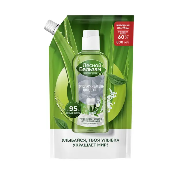 Лесной Бальзам Природная свежесть — ополаскиватель для десен с натуральными ингредиентами и приятным мягким вкусом, предназначенный для комплексной гигиены полости рта от кариеса. Формула средства на 98% состоит из компонентов натурального происхождения и усилена минералами и экстрактами трав: Минералы морской соли помогают укрепить зубную эмаль и предотвратить разрушающее действие налета на зубы и десны. Сок алоэ и экстракт белого чая поддерживают здоровье десен. В составе нет спирта. Ополаскиватель для полости рта борется с зубным налетом, который является первопричиной развития многих стоматологических проблем и влияет на изменение цвета зубов. Средство действует сразу в нескольких направлениях: Позволяет удалить остатки налета в труднодоступных для щетки местах. Защищает от зубного камня, вызывающего кровоточивость десен. Снижает скорость повторного появления налета до 95%* и надолго сохраняет ощущение чистых зубов. Способствует укреплению зубов и десен. Ополаскиватель для зубов подходит для ежедневного использования. Также его можно применять для усиленной гигиены при ношении брекетов и съемных зубных протезов — средство обеспечит дополнительную защиту от развития кариесогенной микрофлоры и локальных очагов воспаления.