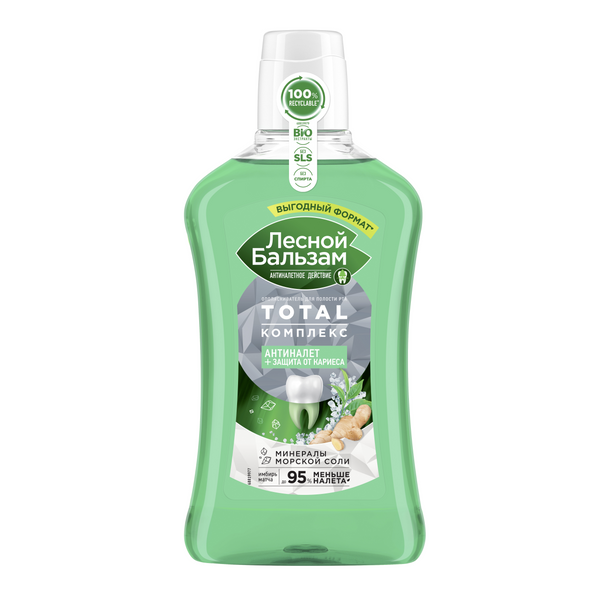 Попробуй новый ополаскиватель для комплексной защиты зубов и десен – Лесной бальзам TOTAL – ТОТАЛ Комплекс с морской солью, экстрактом имбиря и чаем матча, в составе которого 98% ингредиентов натурального происхождения. Ополаскиватель TOTAL – ТОТАЛ. Комплекс борется с первопричиной развития серьезных проблем полости рта – зубным налетом, который вызывает кариес, влияет на изменение цвета зубов, приводит к образованию зубного камня и кровоточивости десен.Формула ополаскивателя усилена минеральными компонентами и экстрактами трав, не содержит парабенов, SLS и спирта и рекомендована стоматологами для ежедневного использования: • морская соль помогает предотвратить разрушающее действие налета на эмаль зубов; • экстракт имбиря и чай матча укрепляют десны, защищая их от воспаления и кровоточивости. Используй ополаскиватель Лесной бальзам TOTAL – ТОТАЛ Комплекс после каждой чистки зубов и избавься от налета в два счета! Он поможет значимо улучшить домашнюю гигиену полости рта, а именно1: • качественно очищать межзубные промежутки; • сохранять ощущение чистых зубов за счет снижения скорости повторного образования налета на зубах; • препятствовать образованию зубного камня; • заботиться об укреплении десен и зубов.