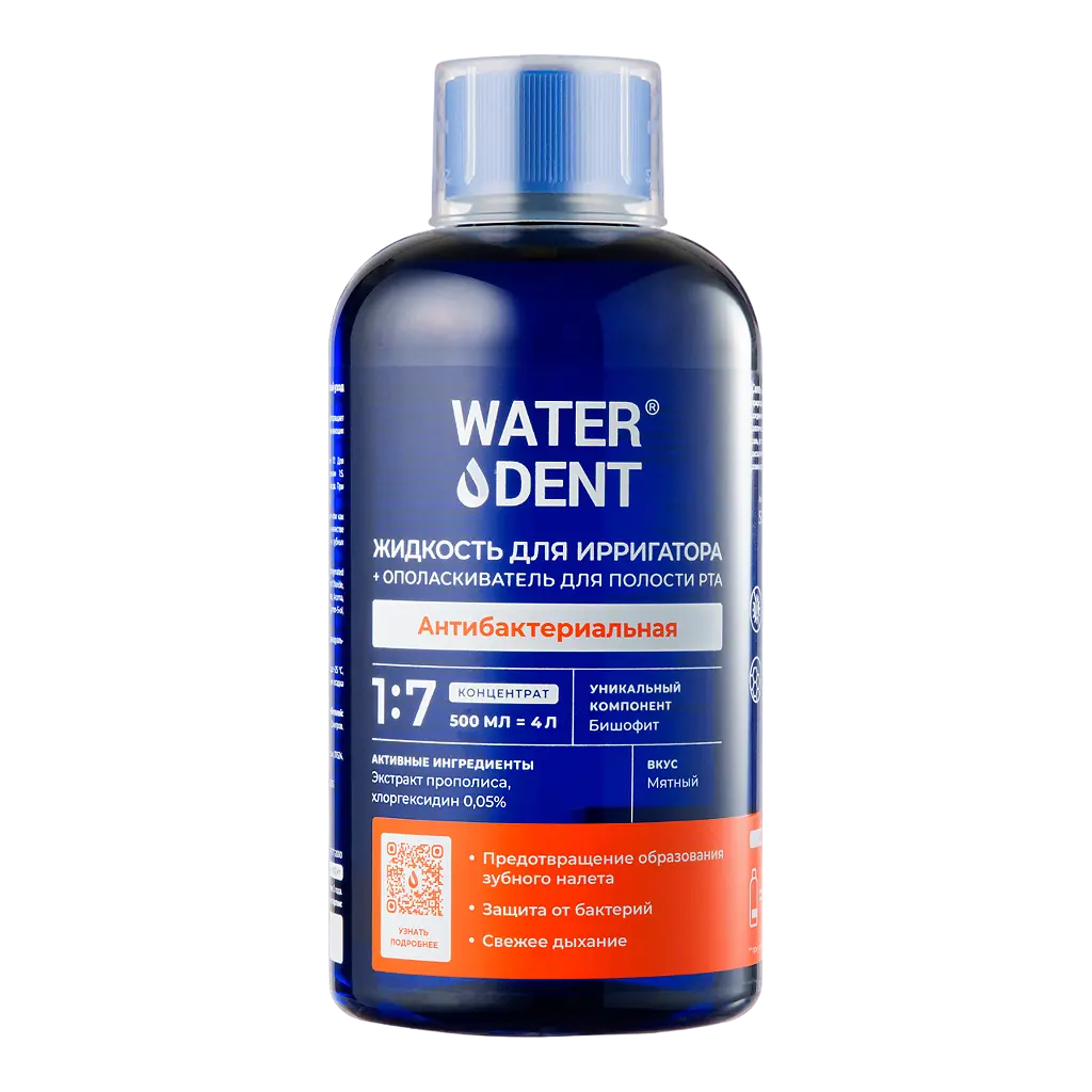 "Жидкость для ирригатора + ополаскиватель для полости рта 2в1 «WATERDENT» Антибактериальная эффективно защищает от бактерий, предотвращает образование налета и освежает дыхание. Идеальное средство после стоматологических процедур.