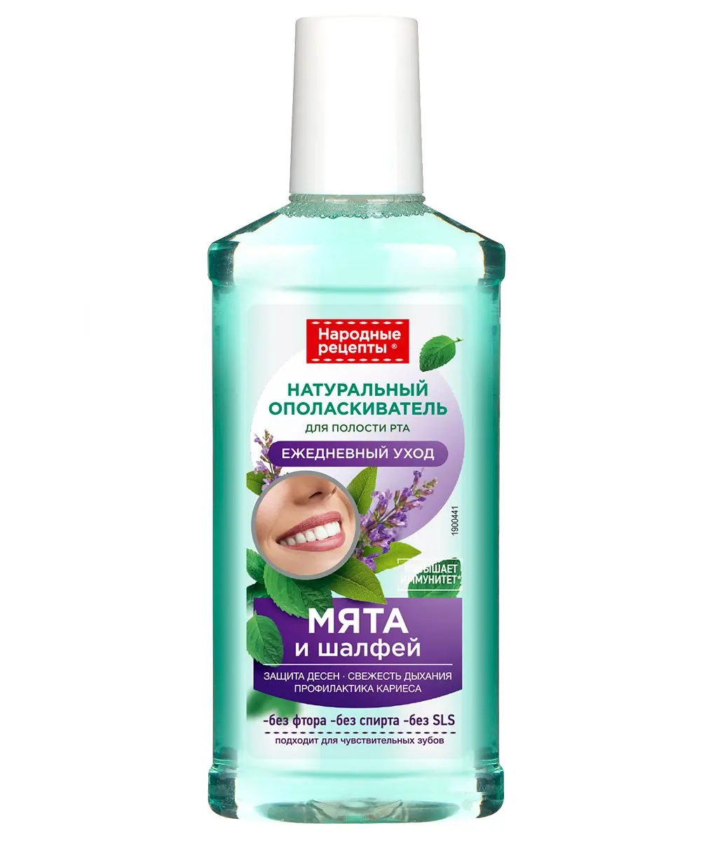 Натуральный ополаскиватель для полости рта Ежедневный уход серии Народные Рецепты — высокоэффективное средство для ухода за полостью рта, в котором сочетаются лучшие натуральные ингредиенты и новейшие достижения в области стоматологии. Ополаскиватель с мятой и шалфеем эффективно укрепляет десны и зубную эмаль, с первого применения заметно снижает чувствительность зубов. Мята обладает успокаивающим свойством, способствует снятию воспаления десен и надолго освежает дыхание. Шалфей повышает регенерацию тканей, защищает зубы от появления зубного камня и кариеса. Ежедневное использование ополаскивателя «Мята и шалфей» в комплексе с зубными пастами серии Народные Рецепты — наилучшее решение для сохранения свежего дыхания и здоровья всей полости рта.