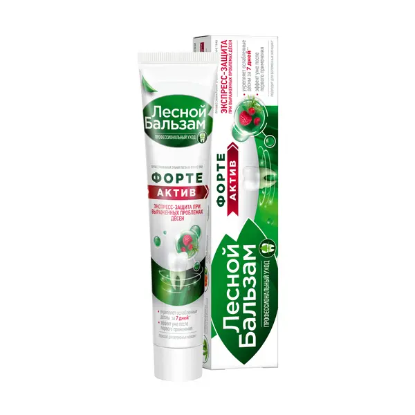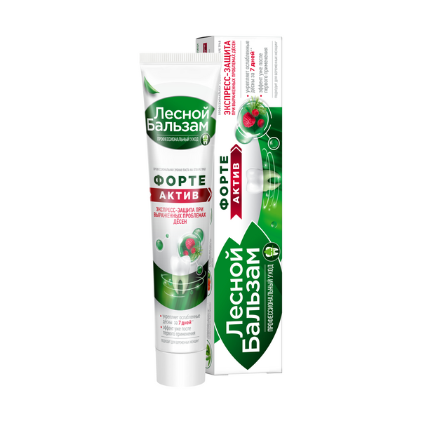 Профилактическая зубная паста Лесной бальзам Форте Актив содержит повышенную концентрацию натуральных экстрактов для усиленного восстановления десен. Лесной бальзам зубная паста усилена маслом чайного дерева и уже с первого дня активирует иммунитет полости рта*, повышая естественную защиту зубов и десен от вредных бактерий. Клинически-доказанный эффект*: 1) Эффективна с первого применения. 2) В 2 раза снижает воспаление и кровоточивость десен Особенности состава: 1) В состав зубной пасты входит хвойный комплекс с тройной концентрацией отвара трав и 8 фитоэкстрактов. Богатый растительный состав продукта способствует быстрому снижению воспаления и кровоточивости десен, улучшает питание мягких тканей полости рта. 2) Паста имеет насыщенный хвойный вкус с богатым вкусом ягод и лечебных трав. Цвет пасты обусловлен высоким содержанием натуральных экстрактов в составе. 3) Зубная паста изготовлена на отваре 5 трав (ромашка, тысячелистник, крапива, зверобой, чистотел). Отвар трав используется взамен обычной воды и получается в результате низкотемпературной экстракции (35%), что позволяет достичь максимально полного переноса ценных веществ из растений в отвар. 4) Зубная паста бережно очищает эмаль за счет природного абразива - диоксида кремния (Silica).