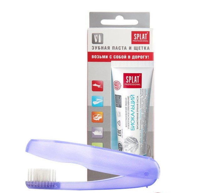 В дорожный набор входит: мини-упаковка (40 мл) зубной пасты СПЛАТ ПРОФЕССИОНАЛ БИОКАЛЬЦИЙ и складная зубная щетка.