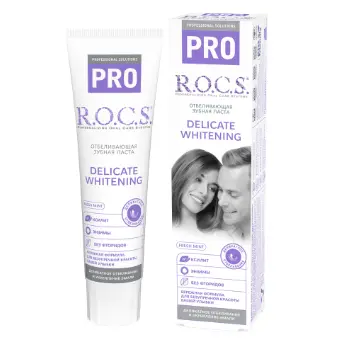 Паста для зубов R.O.C.S. PRO. «Деликатное Отбеливание» со вкусом Fresh Mint подходит для регулярного ежедневного использования. Она, без сомнения, понравится тем, кто любит освежающий яркий вкус мяты и выбирает только лучшую защиту для своих зубов и десен.