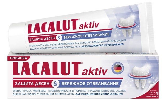 Эта зубная паста создана специально для людей, склонных к воспалительным заболеваниям десен и стремящихся к отличной гигиене полости рта. Зубная паста Lacalut aktiv защита десен&бережное отбеливание разработана на основе рецептуры классического Lacalut aktiv. Основной состав пасты дополняют гиалуроновая кислота, которая увлажняет слизистую оболочку полости рта, и растительные ферменты для осветления зубной эмали. Антисептик в составе пасты эффективно снижает количество бактерий, вызывающих воспаление, лактат алюминия заметно снижает кровоточивость десен, фторид укрепляет эмаль и защищает от кариеса.