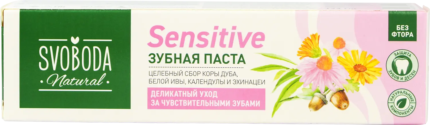 Благодаря использованию специально подобранной щадящей очищающей системы и мягкого пенообразующего вещества на основе природного сырья зубная паста Svoboda Sensitive подходит для деликатного ухода за чувствительными зубами.