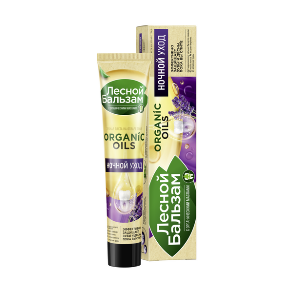 Встречай натуральную защиту зубов и дёсен' от бренда Лесной бальзам – зубную пасту Ночной Уход с органическими маслами и гидроксиапатитом кальция. Создана специально для надежной защиты зубов и десен во время сна. • Гидроксиапатит кальция укрепляет и восстанавливает ослабленную эмаль. • Специальный состав эффективно защищает от бактерий и борется с образованием бактериального налета между зубами. • Отвар трав оказывает противовоспалительное и укрепляющее действие на десны. • Органическое масло лаванды оказывает успокаивающий и расслабляющий эффект. Формула зубной пасты Ночной Уход борется с первопричиной развития серьезных проблем полости рта – зубным налетом. Именно зубной налет вызывает кариес, влияет на изменение цвета зубов, приводит к образованию зубного камня и появлению кровоточивости десен. Зубы и десны надежно защищены, пока ты спишь. Зубная паста не содержит парабенов, химических отбеливателей и фтора. Подходит для ежедневной защиты зубов и десен.