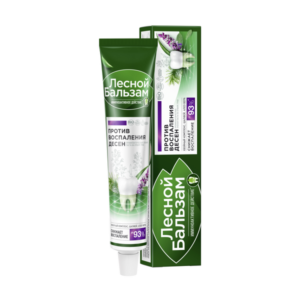 Профилактическая зубная паста Лесной бальзам на отваре трав c иммуноактивным действием помогает решить проблему воспаления десен и в 2 раза улучшает работу собственного иммунитета полости рта, снижая риск развития проблем с деснами*. Клинически-доказанный эффект: - С первого применения исчезает болезненность десен* - До 94% снижает воспаление десен при регулярном использовании** - В 5 раз снижает скорость образования налета на зубах, уменьшая бактериальную нагрузку на мягкие ткани полости рта** Особенности состава: Насыщенный хвойный вкус. Содержит хвойный комплекс (на основе экстрактов пихты, живицы, можжевельника) с отваром 5 целебных трав, экстрактом шалфея и соком алоэ. Богатый натуральный состав способствует снижению воспаления и отечности десен, блокирует развитие воспалительного процесса и стимулирует восстановление мягких тканей полости рта. Зубная паста изготовлена на отваре 5 трав (ромашка, тысячелистник, крапива, зверобой, чистотел). Отвар трав используется взамен обычной воды и получается в результате низкотемпературной экстракции (35%), что позволяет достичь максимально полного переноса ценных веществ из растений в отвар. Зубная паста бережно очищает эмаль за счет природного абразива - диоксида кремния (Silica).