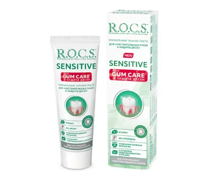 Лечебно-профилактическая зубная паста R.O.C.S.® «Plus GUM CARE» разработана для ежедневной гигиены полости рта для людей, страдающих от повышенной чувствительности зубов и дёсен. Уникальная формула с низкоабразивными частицами деликатно и эффективно удаляет зубной налет, укрепляет эмаль, насыщая ее необходимыми минералами, снимает симптомы чувствительности зубов, существенно улучшает состояние десен и слизистых ротовой полости. Эффект заметен после первого применения.