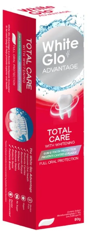 Формула зубной пасты White Glo Advantage Тотальная защита обеспечивает эффективный уход за полостью рта. Бромелайн (экстракт ананаса) эффективно расщепляет налет в самых труднодоступных местах и делает зубы гладкими. Экстракты алоэ вера и шиповника ухаживают за деснами и слизистыми оболочками и оказывают противовоспалительное действие.