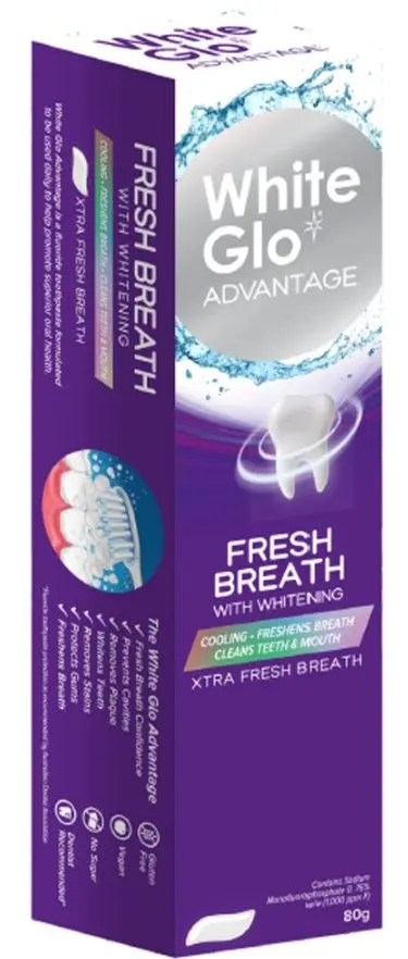 Формула зубной пасты White Glo Advantage Свежее дыхание эффективно очищает и освежает полость рта, бережно отбеливает зубы. Бромелайн (экстракт ананаса) расщепляет налет в самых труднодоступных местах и делает зубы гладкими. Экстракт перечной мяты оказывает противовоспалительное и ухаживающее действие, способствует длительному и стойкому свежему дыханию.