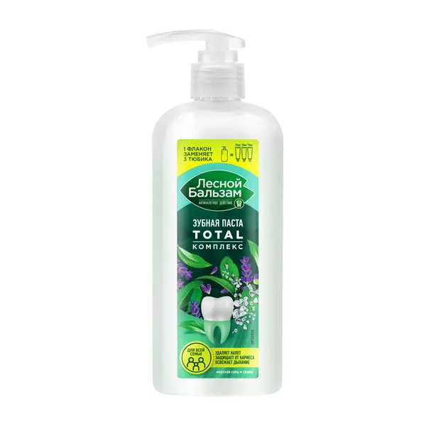 Для ежедневного ухода за зубами и полостью рта попробуй зубную пасту Лесной Бальзам TOTAL Комплекс для всей семьи Морская соль и травы, в составе которой 95% ингредиентов натурального происхождения*. Увеличенный объем во флаконе с удобным дозатором экономичен в использовании: одного нажатия достаточно для одной чистки зубов. Флакон вмещает в себя 3 тюбика зубной пасты и рассчитан на 4-5 месяцев использования. Зубная паста воздействует комплексно: • Поддерживает естественную белизну и здоровье зубов. • Укрепляет зубную эмаль, предупреждая возникновение чувствительности зубов, благодаря наличию в составе минеральной соли и экстрактов трав (ромашки, тысячелистника, зверобоя, чистотела и крапивы). • Удаляет налет и защищает от кариеса благодаря содержанию фторида натрия в активной концентрации. • Мягко освежает дыхание. Чисти зубы 2-3 минуты не реже 2 раз в день. Для максимального эффекта'' используй ополаскиватель Лесной бальзам после каждой чистки зубов. Он удалит налет в труднодоступных для щетки местах: с дальних зубов, в межзубных промежутках, с внутренней поверхности зубов и с языка. Результат: эмаль зубов бережно очищена, десны защищены. Подходит для использования взрослыми и детьми с 7 лет.