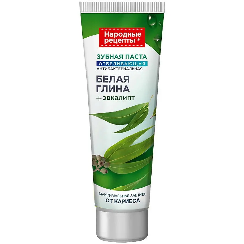 Зубная паста Отбеливающая антибактериальная быстро и эффективно отбеливает зубы, максимально защищая от кариеса. Белая глина удаляет зубной налет, снижает риск появления кариеса, а также делает эмаль заметно белее. Экстракт эвкалипта обладает антибактериальным эффектом, успокаивает слизистую оболочку и поддерживает свежее дыхание надолго. Зубная паста «Народные рецепты» - сама природа, которая надолго сохранит ваши зубы белыми и здоровыми, подарит красивую улыбку и свежесть!