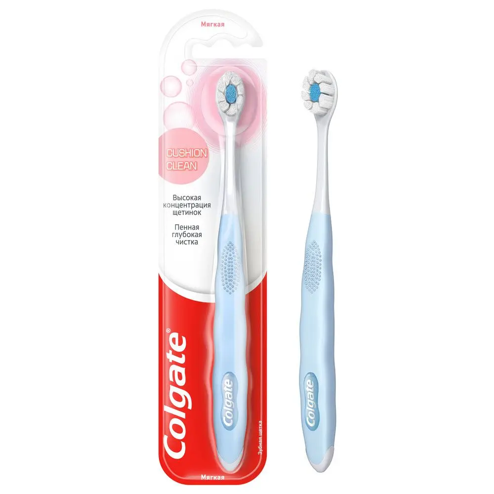 Щетка от производителя Colgate для зубов Cushion Clean с мягкими щетинками, расположенными плотно друг к другу, образует больше пены для лучшего действия зубной пасты, а также оказывают мягкое и массирующее
