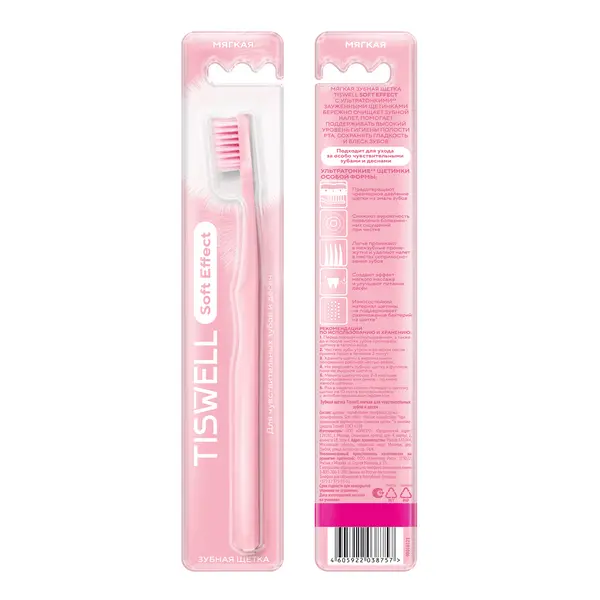 Мягкая зубная щетка для более тонких десен Tiswell Soft effect — это инструмент для эффективного ухода за полостью рта. Щетка для зубов Tiswell представляет собой идеальное сочетание простоты использования, качества и доступности. Зубная щётка мягкая розовая оснащена специальными ультратонкими** щетинками особой формы. Зубная щетка для чувствительных зубов и десен с ультратонкими** зауженными щетинками позволяет увеличить давление на эмаль. Щетка зубная мягкая Tiswell Soft effect снижает вероятность появления болезненных ощущений при чистке зубов. Щетка для чистки зубов ультратонкими** щетинками бережно очищает налет. Розовая зубная щетка-набивка для взрослых с ультратонкими** щетинками создает эффект мягкого массажа и улучшает питание десен. Мягкая зубная щетка для взрослых помогает сохранить гладкость, блеск и естественную белизну зубов. Ультратонкие** зауженные щетинки легко проникают в межзубные промежутки, удаляемые там налет.