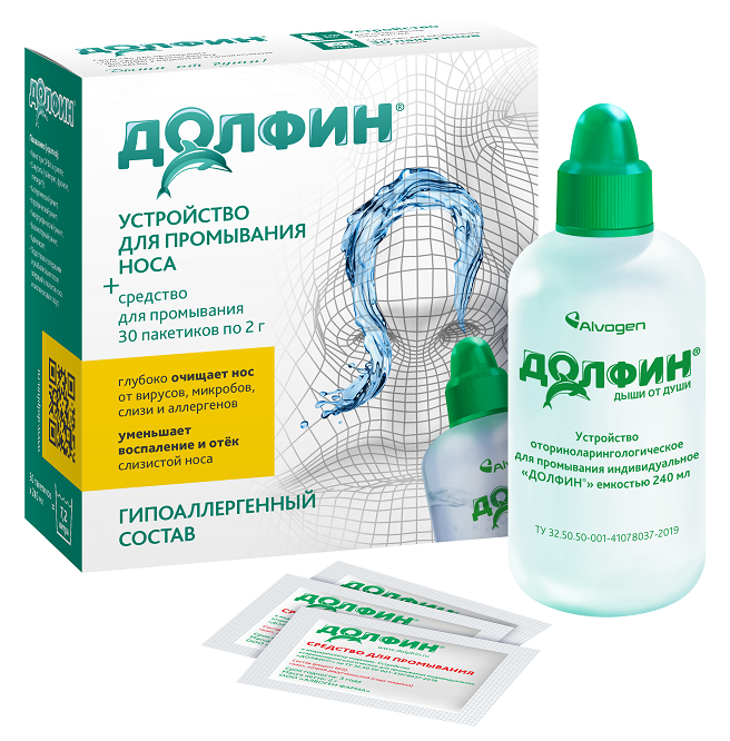 Долфин гипоаллергенный – устройство и специальное средство для для промывания носа, способствуют удалению вирусов, бактерий и аллергенов за счет сквозного объемного промывания, в составе только соль - для снижения риска аллергии.