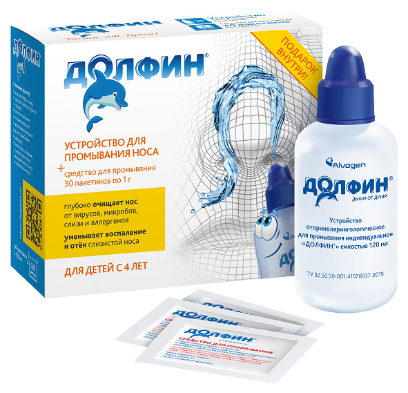 Долфин детский – устройство и специальное средство для промывания носа у детей с 4-х лет, способствуют удалению вирусов, бактерий и аллергенов за счет сквозного объемного промывания, 30 пакетов суммарно дают более 3 литров жидкости для промывания.