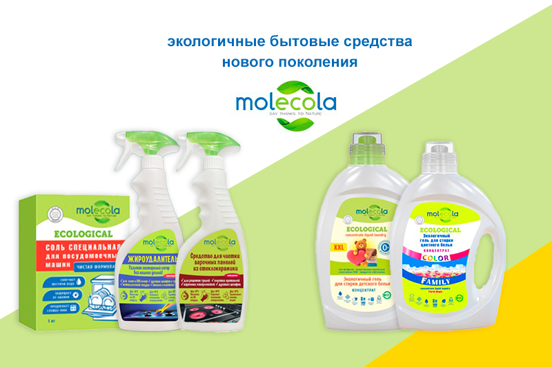 Molecola – бренд экологичных бытовых средств нового поколения на основе натуральных растительных ингредиентов. Во всей продукции отсутствуют опасные для человека и окружающей среды компоненты, а в качестве упаковочных материалов компания использует пластиковые флаконы, которые подлежат переработке.