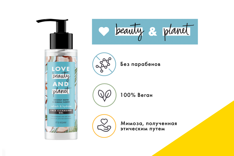 Ежедневное использование геля Love Beauty and Planet Свежесть и увлажнение кожи c кокосовой водой и цветами мимозы позволяет восстановить и сбалансировать кожу, наполнить ее влагой и питательными элементами. Благодаря содержанию марокканской мимозы, полученной этическим путем из региона Хемисет в Марокко, гель бережно очищает от загрязнений, излишней жирности и косметики.